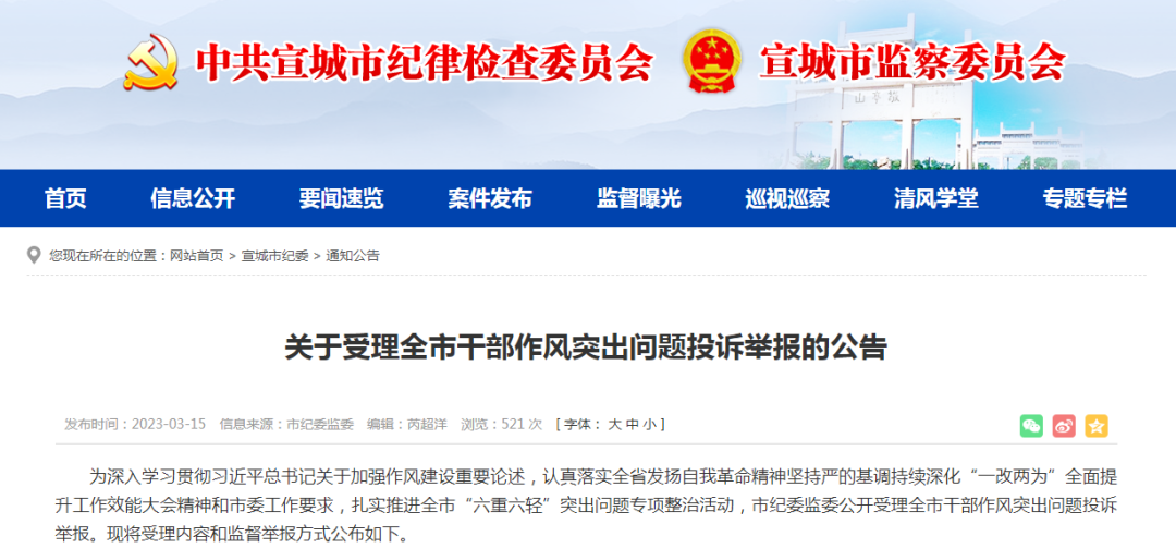 工作“躺平”、“吃心”不改、酒瘾难戒、热衷组局、打牌掼蛋……日前,安徽省宣城市纪委监委发布“关于受理全市干部作风突出问题投诉举报的公告”,上述行为均在举报范围之类。举报方式中,除了来信地址和受理电话,还有网站和新媒体渠道,公告还附上了举报微信二维码。